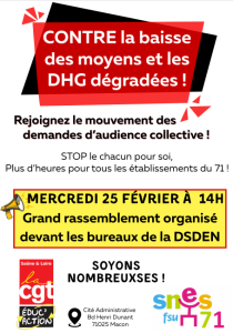 Ainsi, à l’initiative de la CGT éduc’Action 71 et du SNES-FSU 71, un rassemblement le plus large possible est organisé le mercredi 25 février (jour des audiences) à partir de 14h devant la cité administrative de Mâcon (siège de la DSDEN). Les établissements ayant fait remonter leurs besoins exigeront sur place d’être reçus tous ensemble.